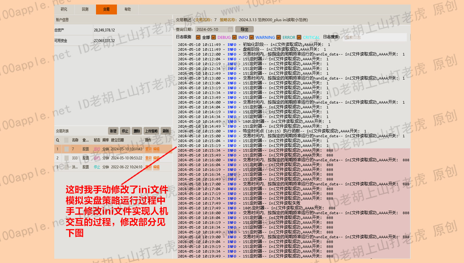 3、通过手工修改ini文件,实时与策略进行了模拟实盘过程中的人机交互,并且在日志中打印和显示了出来,加深大家对通过ini 文件与策略进行交互的过程有一个感性认识。