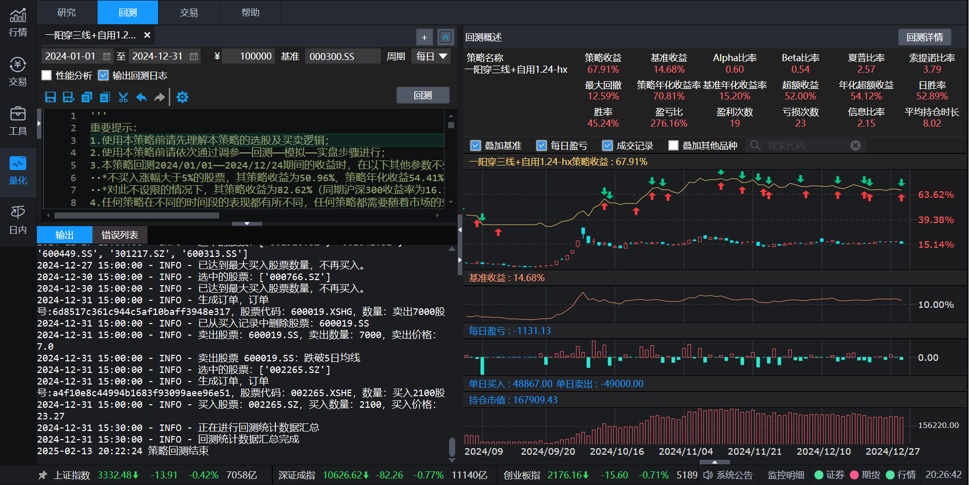 回测数据:策略收益67.91%,策略年化收益70.81%,最大回撤12.59,夏普比例2.57,盈亏比276.16%;