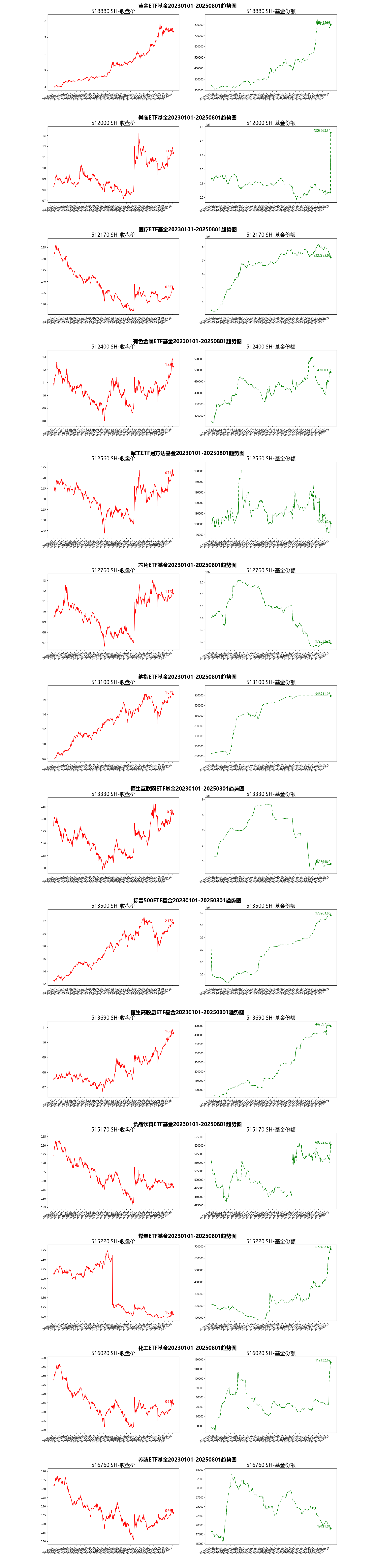 下图为宽基ETF 2023年1月1日-2025年8月1日收盘价与基金份额趋势图数据统计 。趋势图中左图为基金收盘价的走势,右图的基金份额数走势增加预示着有新的资金流入,份额数走势下降代表有资金流出。