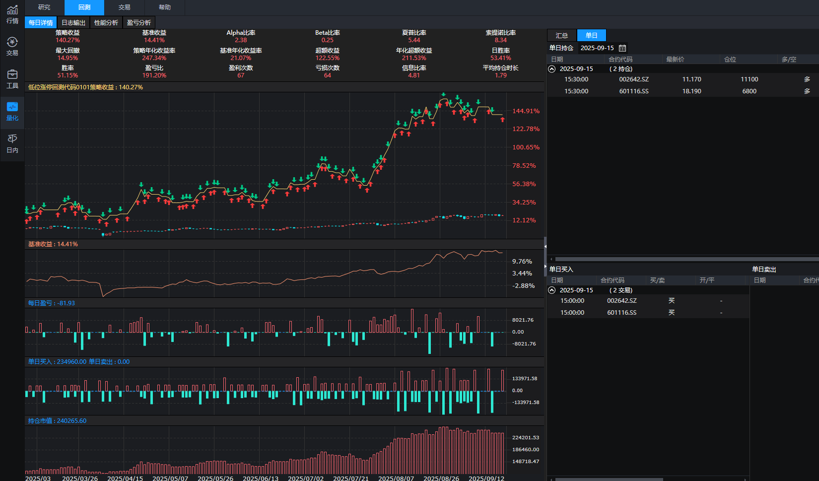 做为小散户要想把资金快速做大,唯一途径就是打涨停,打涨停方法有很多,市场很流行龙头战法,这也叫数板战法,这也是高位接盘战法,这类上涨过程分时图比较极端,上涨过程你往往抱不住,下跌时往往A杀一字跌停你根本卖不掉,本代码买点前置,让别人来给自己接力,市场上目前做得好的就是北京炒家,天天打首板,本人写了一个类似的首板代码。如果想购买低位首板策略做为你投资的参考,请京东app或者京东官网搜索:证券自动量化交易程序小店 。买之前先微下客服,确认下,别买错,非诚勿扰。注意:1.本代码仅供学习参考使用,风险自担。2.代码买以后是终身可以免费使用,系统升级免费售后升级。3.下面图片为今年以来的回测收益,仅供参考。