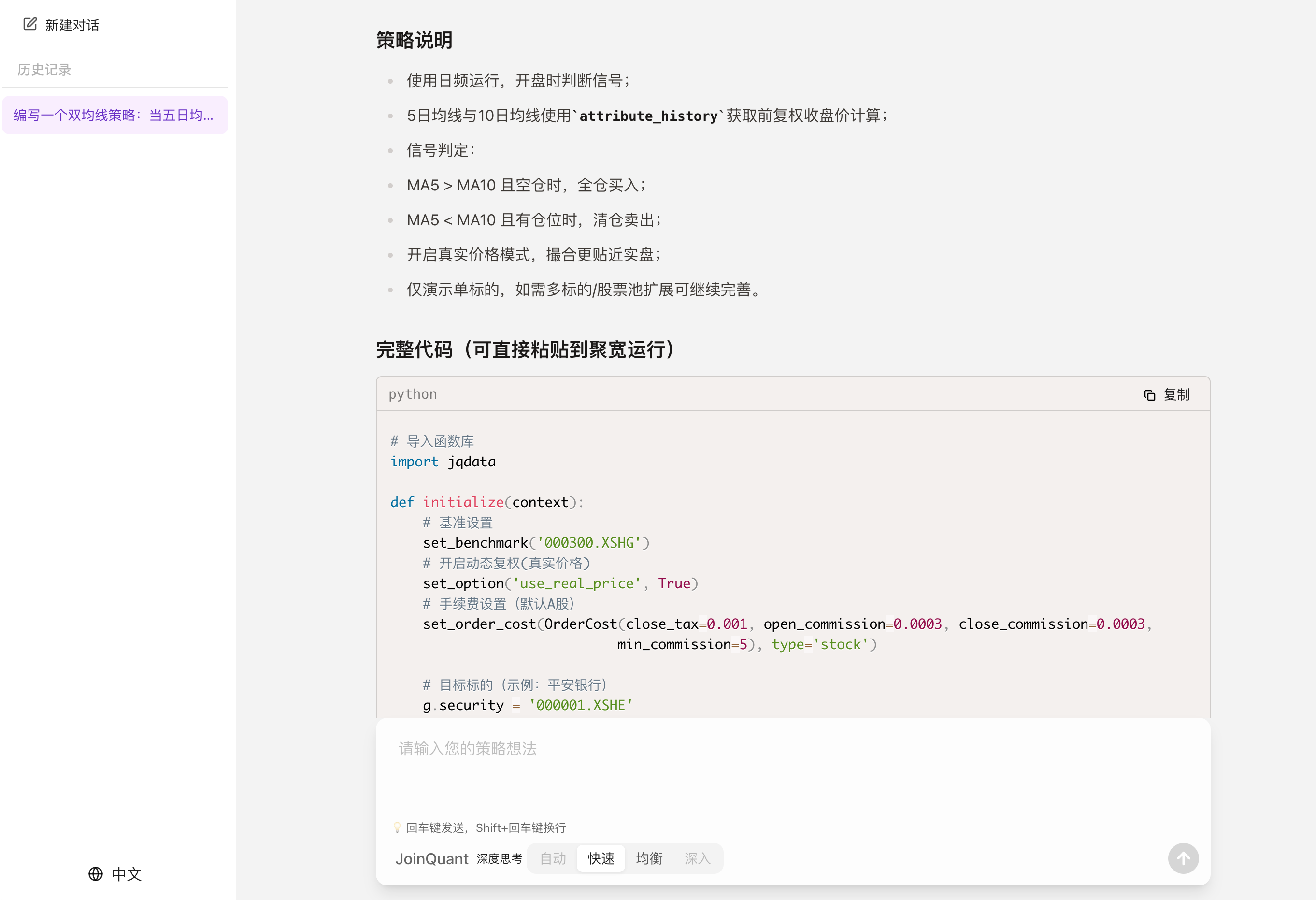不会代码的进,AI编写量化策略代码工具经验分享 Thom516 这家伙很懒,还没有设置简介 0 人点赞了该文章 · 254 浏览 亲测最好用的AI编写量化策略工具,可以让 AI 直接生成各平台(包括PTrade,迅投QMT,聚宽Joinquant,掘金MyQuant,同花顺Supermind等等)上可运行的策略代码,代码质量远高于直接使用 DeepSeek、GPT等平台。AI工具入口:https://iris.findtruman.io/ai/tool/ai-quantitative-trading/大家可以直接向AI描述策略,然后一键生成可运行的完整策略代码,也可以把它当做一个API 查询工具。