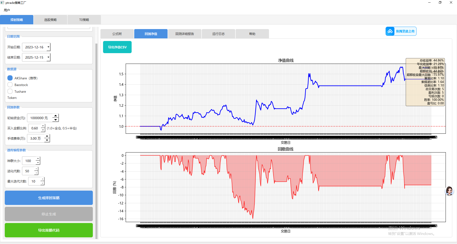 注意:若回测结果不满意,可以重新点击"生成择时策略",生成新的策略结果,满意后进行导出代码。